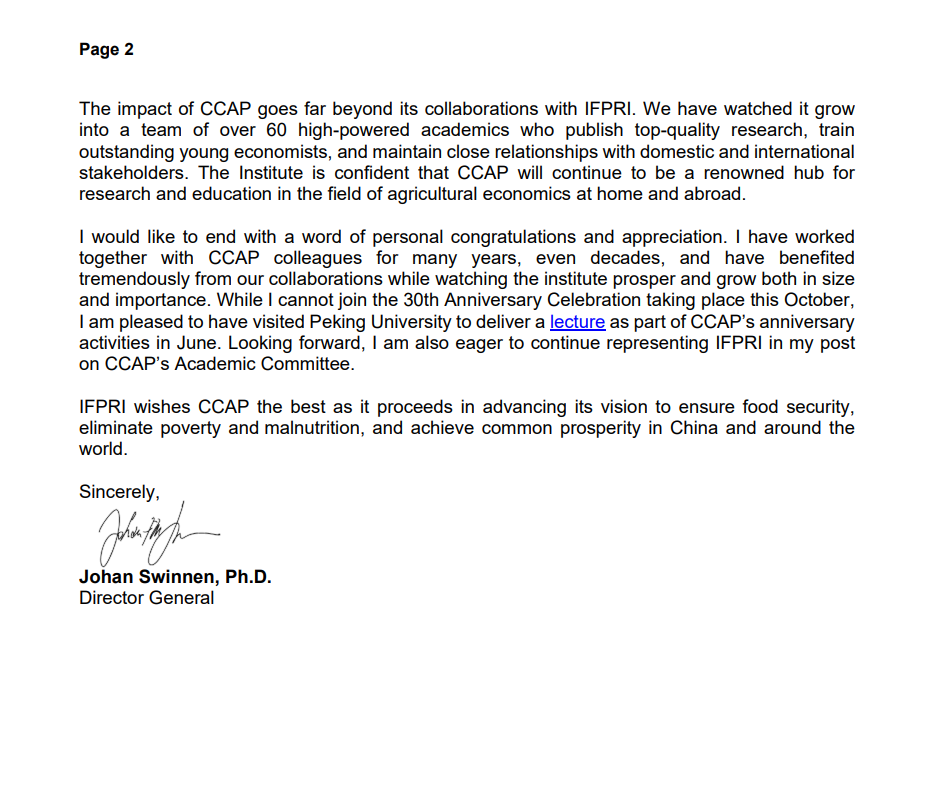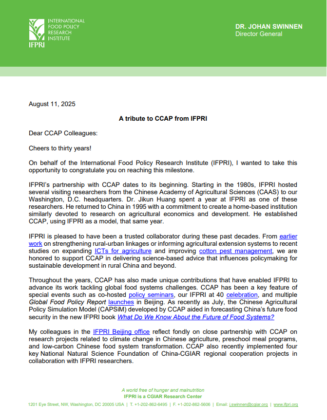 最后,请允许以个人名义,向CCAP表达诚挚的感激与祝福。多年来,我有幸与 CCAP 同仁携手合作,受益匪浅,也亲眼见证了CCAP在规模和影响力上的稳步壮大。虽然遗憾无法出席今年十月的三十周年庆典,但很高兴今年六月在北京大学以讲座形式参与了周年系列活动。展望未来,我将代表IFPRI、继续以学术顾问委员会成员的身份,支持并推动CCAP的不断发展。