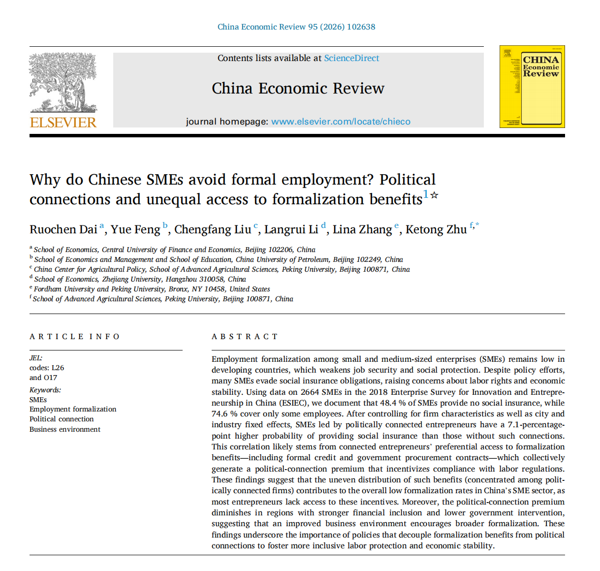 引用来源:Ruochen Dai; Yue Feng; Chengfang Liu; Langrui Li; Lina Zhang, Ketong Zhu, 2026. Why Do Chinese SMEs Avoid Formal Employment? Political Connections and Unequal Access to Formalization Benefits, China Economic Review 95(2026) 102638.